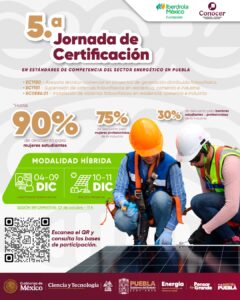 PUEBLA, Pue.— El gobierno del estado, a través de la Agencia de Energía de Puebla y en alianza con la Fundación Iberdrola México, anunció la Quinta Jornada de Certificación en Estándares de Competencia del Sector Energético, que se llevará a cabo del 4 al 11 de diciembre en modalidad híbrida: actividades teóricas virtuales y prácticas presenciales en el INAOE.