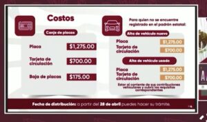 Detalló que estarán disponibles a partir del 28 de abril, con un costo total de 2 mil 150 pesos, que incluye el canje de placas, tarjeta de circulación y baja del vehículo.